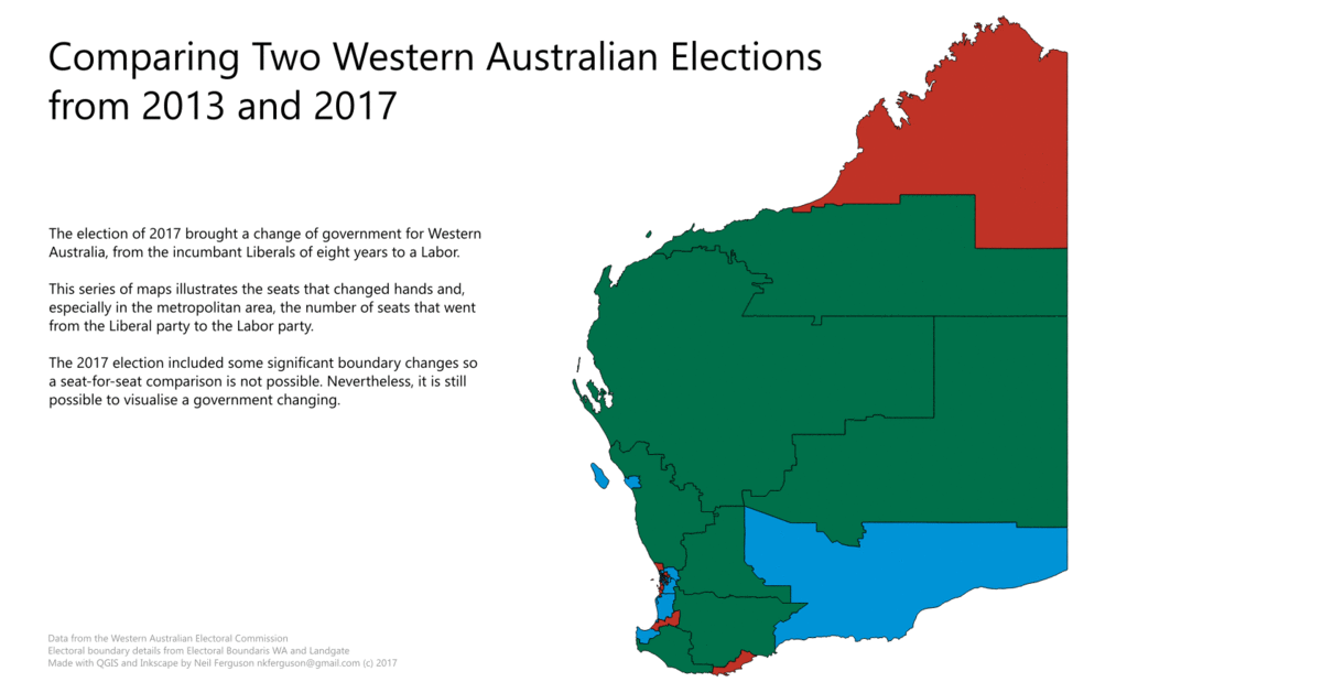 Given the comprehensive victory of WA Labor, it seemed obvious to make an animation of some sort to see the shift from Liberal to Labor happen. This proved to be a little more difficult since for some as yet unknown reason, the WAEC and WA Boundaries – the government sections directly responsible – do not provide polygon files in any form for any other election even the one immediately prior. I asked the question on their site and was, essentially, fobbed off to Landgate, presumably, their data service. It appears from the reply I received, that Landgate make the files based on the information provided to them, a fee-for-service to WA Boundaries. After a good deal of searching and enquiries, I was able to find them as shapefiles.